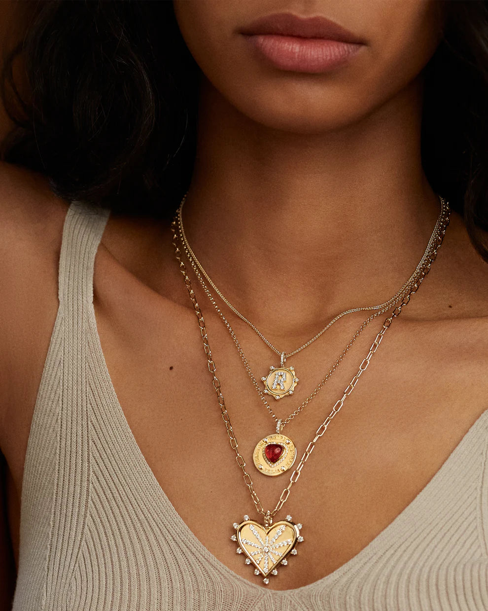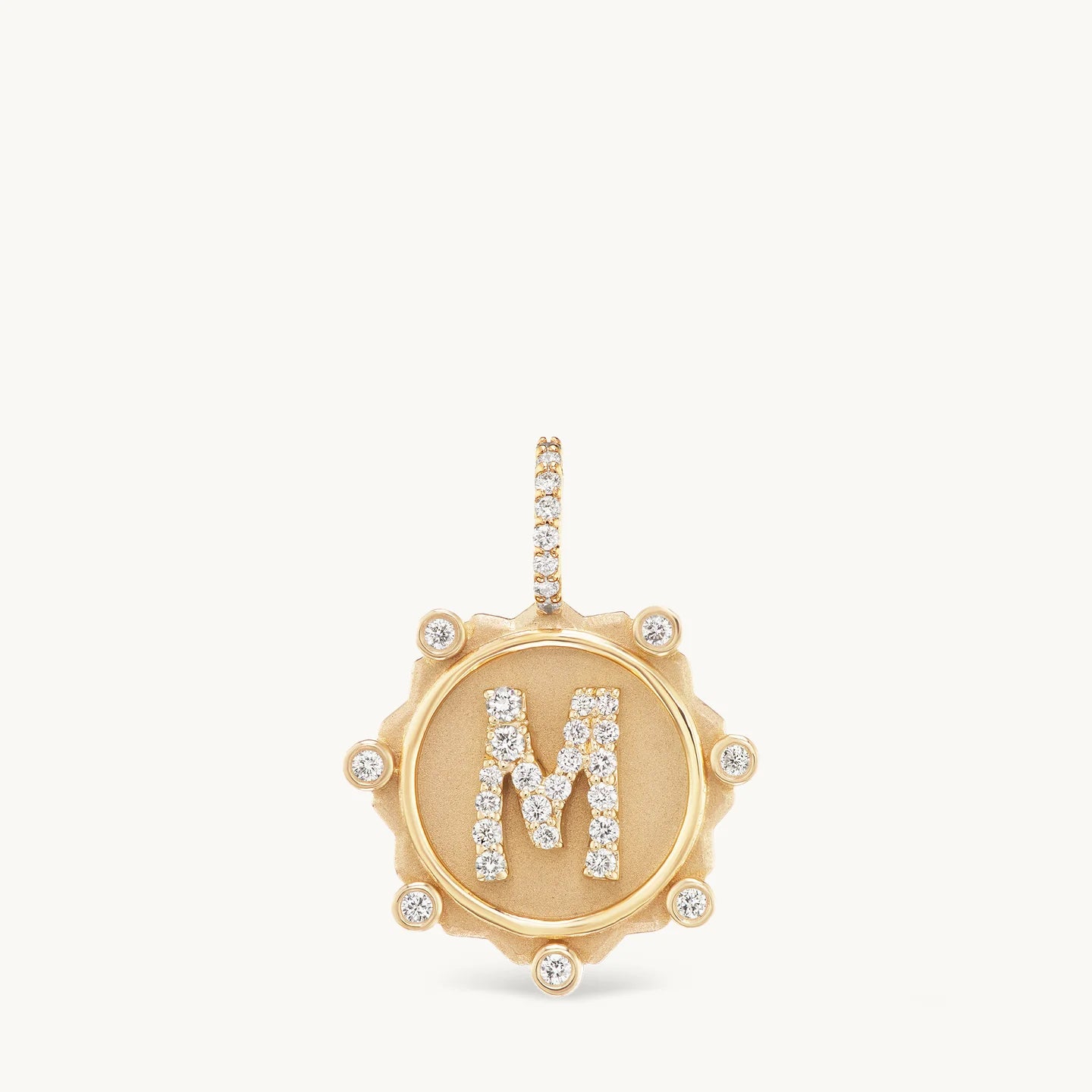 This Alphabet Coin with a pavé-set diamond bail features initials in Marlo Laz's bespoke font. The white diamond pavé letter at the center is surrounded by a border of seven bezel-set diamonds. Wear it solo or layered with other charms.
