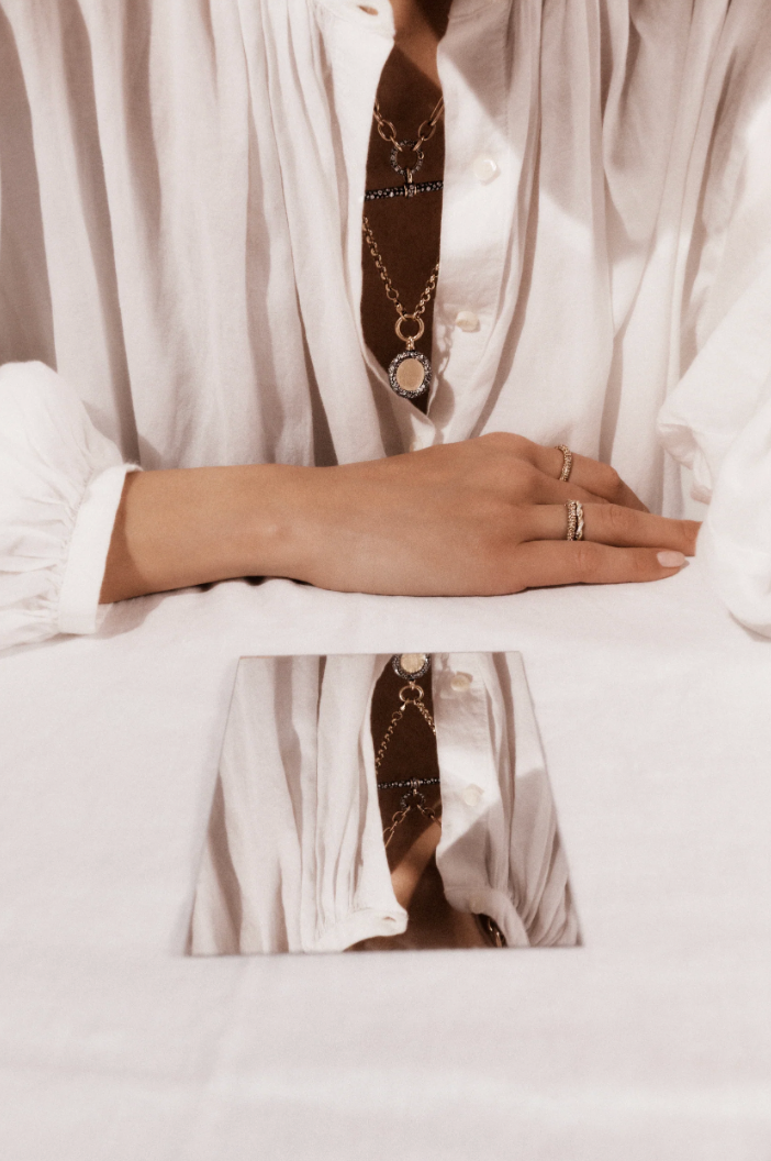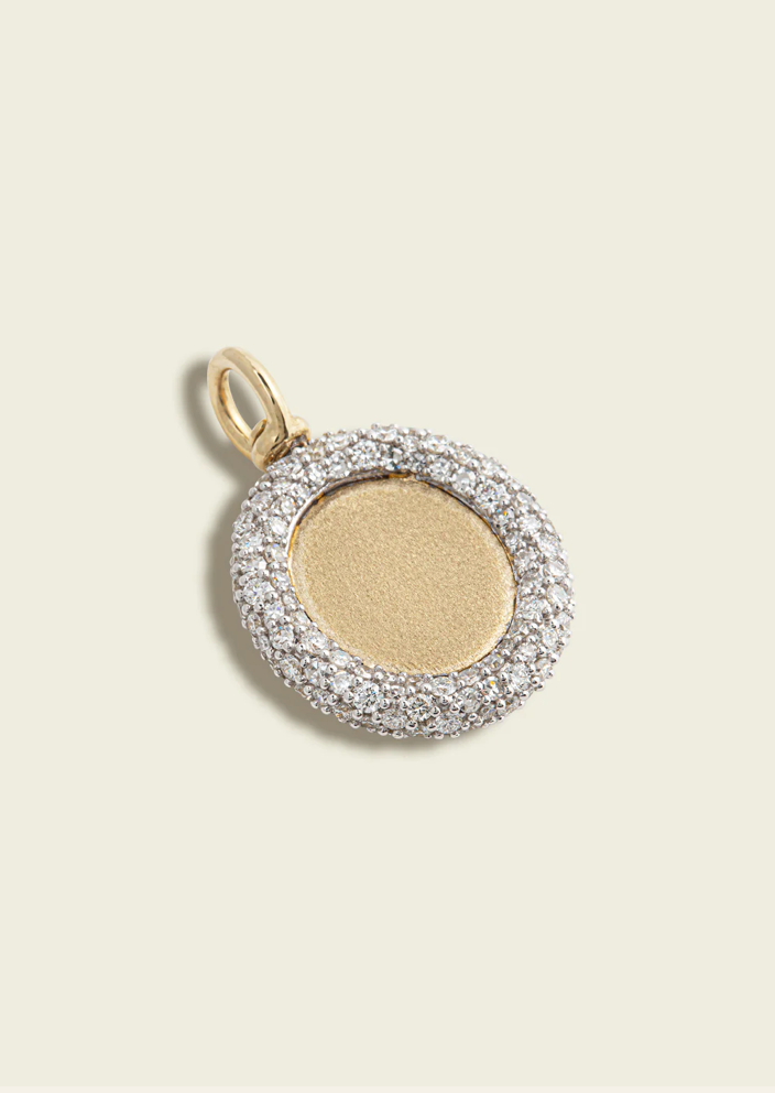 A distinctly Victorian silhouette, the Portrait pendant echoes the form of miniature paintings. Crafted in 14kt yellow gold with Victorian-set pavé, the pendant has a spinning bale and can be engraved on both the front and reverse.