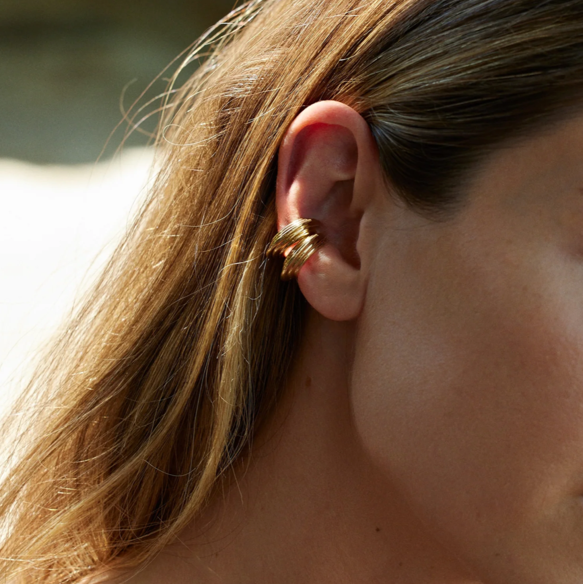 With sculptural details reminiscent of waves, this ear cuff will transport you to a picturesque destination where electric blue water crashes against the cove-studded coastline, and the air is filled with the scent of sweet citrus.