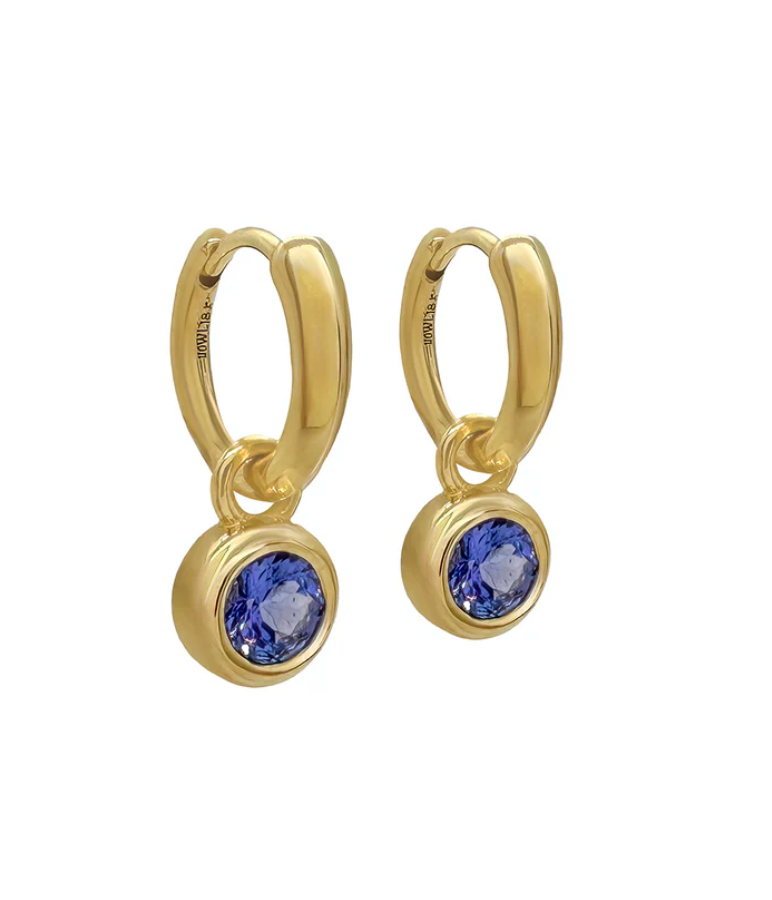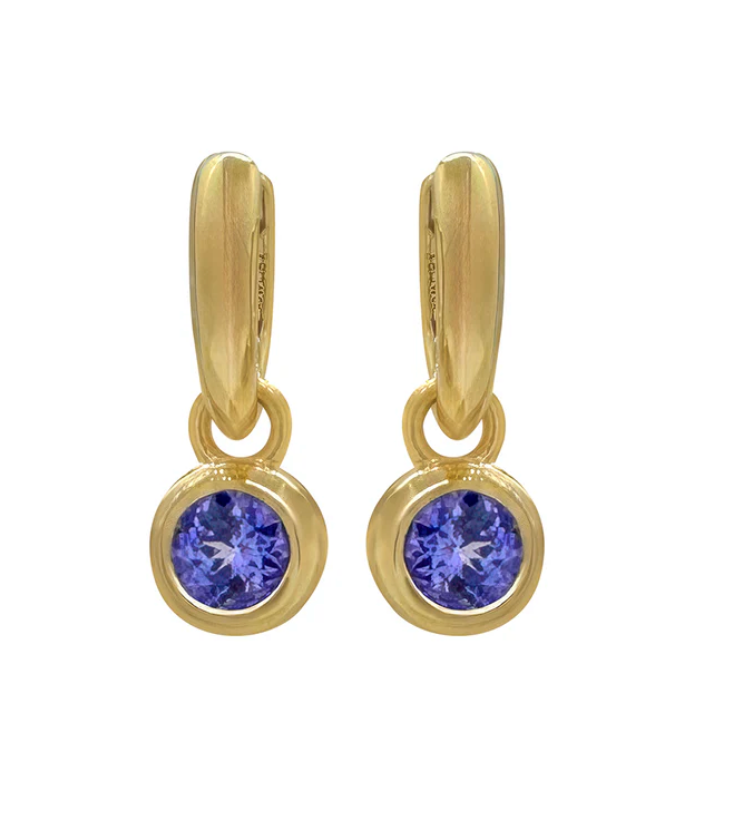 The Rory Hoops with Round Tanzanite are a sleek combination of form and color. Each hoop is fitted with a bezel set round Tanzanite—glimmering with soft shades of indigo and violet.