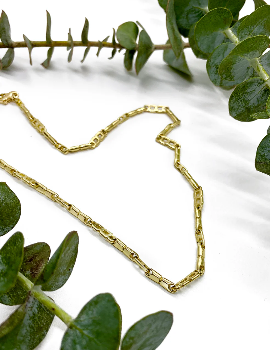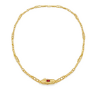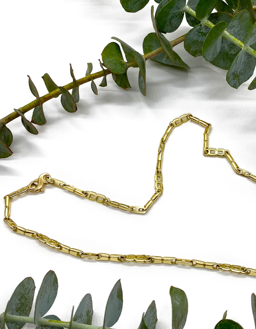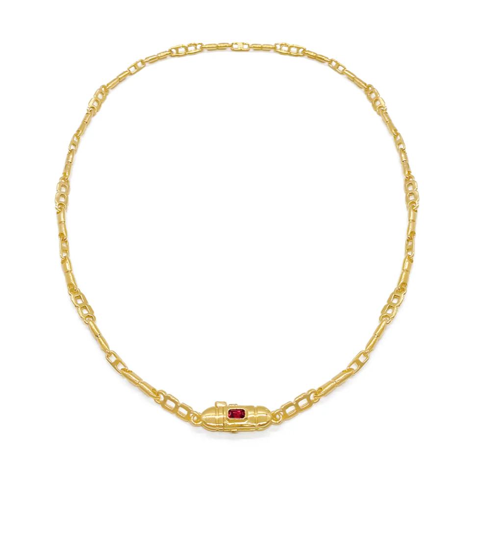 The Tube Link Necklace is a classic HOWL design featuring a variety of oblong links and a Ruby on the clasp. This Necklace comes across as minimalistic in design but upon closer inspection, many unique details can be found in each link. Wearing rubies allows for improved creativity, compassion, and concentration. Every detail was crafted and casted in Los Angeles.