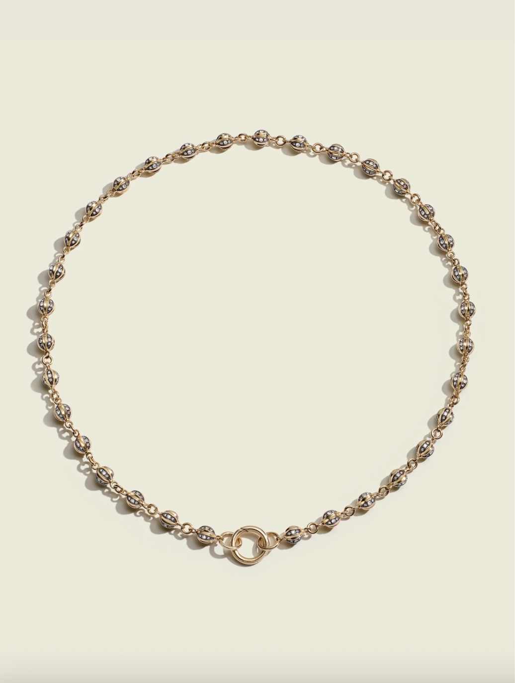 The little sister to our larger version. The Baby Diamond Ball Breaker necklace is a chain of Victorian-set diamond pavé orbs with fluted detail in 14kt gold. The diamond pavé has an antique finish and the necklace is secured with a spring hinge clasp which can be swapped for one of the diamond or gemstone Connections.