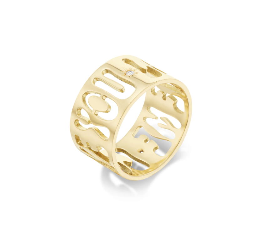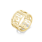 Handcrafted 18k yellow gold ring with cut-out letters. 11 mm.