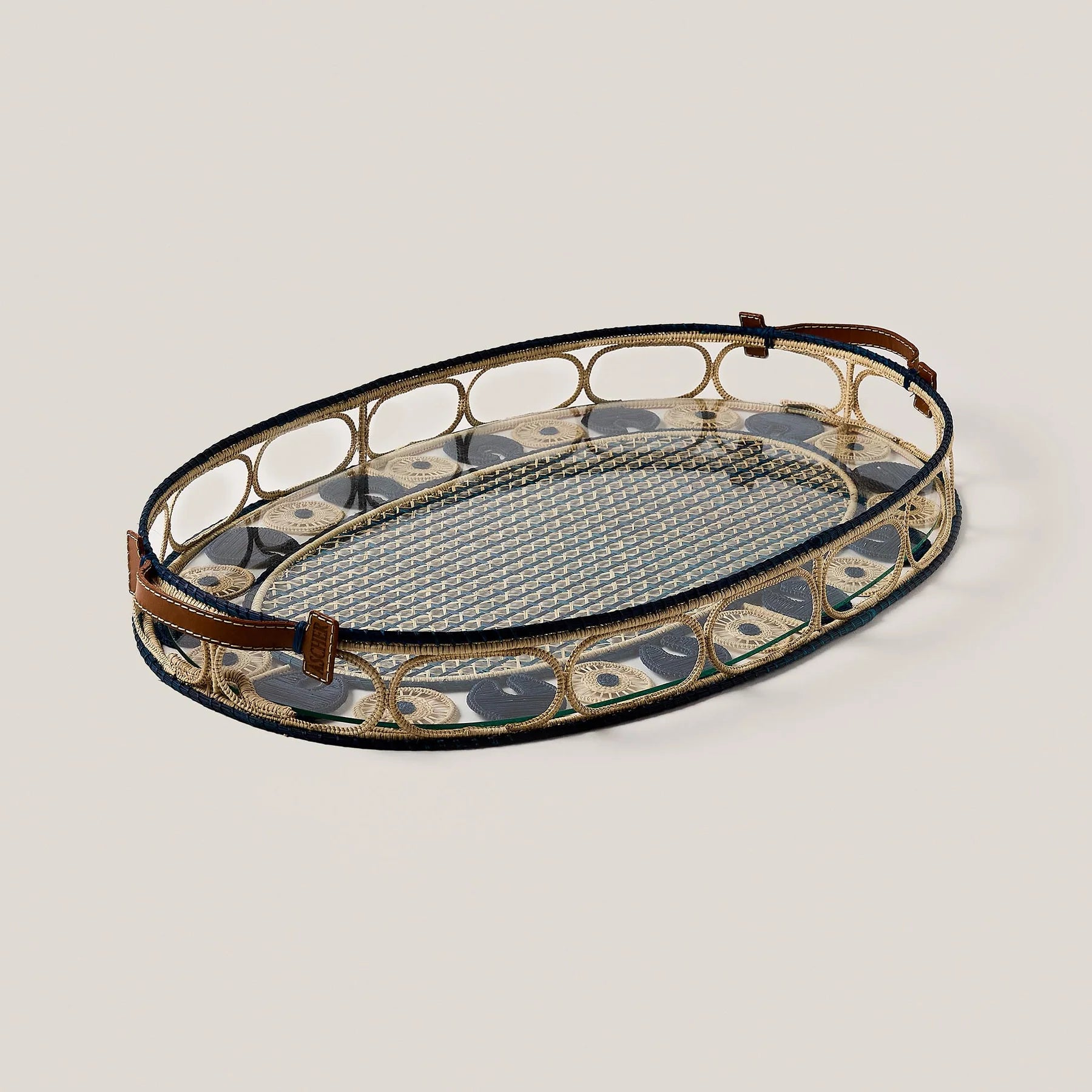 Crafted in Colombia, the " Nuit " oval iraca palm and leather tray showcases the artistry of local craftsmanship.