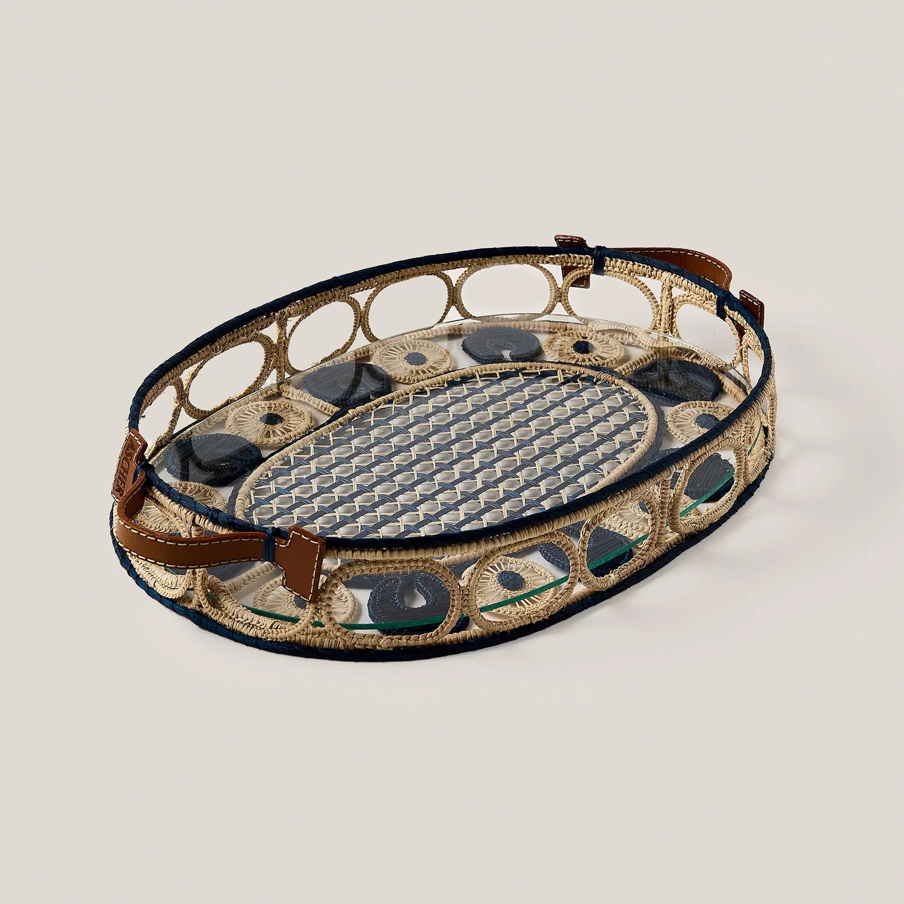 Crafted in Colombia, the oval " Nuit " iraca palm and leather tray showcases the artistry of local craftsmanship.