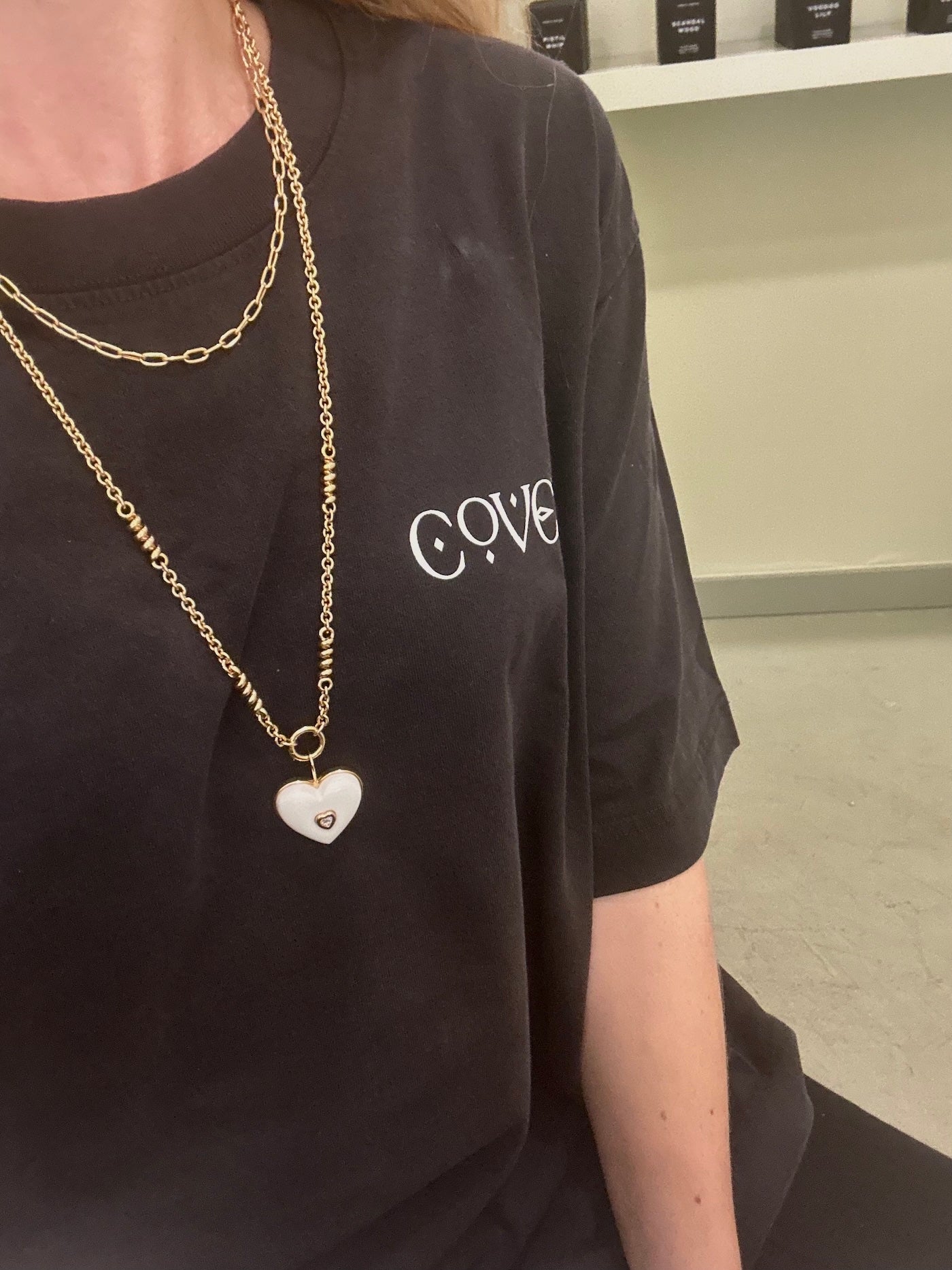 SHOWN ON FIRST MODEL PHOTO IS THE 20 INCHES LONG NECKLACE. THE CHAIN SHOWN IN PICTURE 3 WITH BLACK TEE SHIRT IS OUR 26" CHAIN STYLED WITH AN 18" PAPERCLIP CHAIN