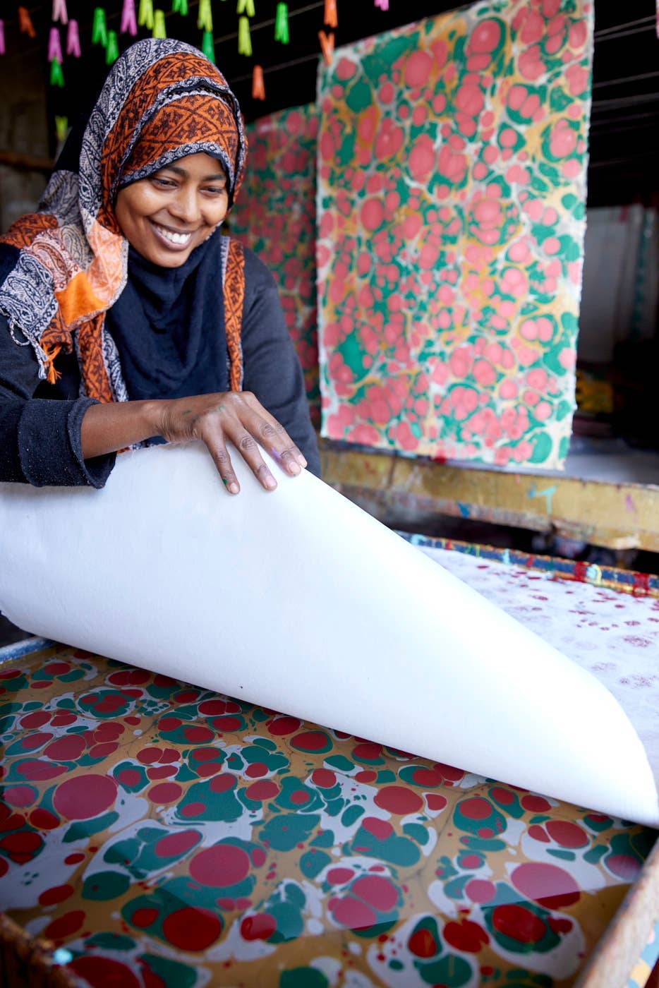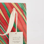 Our hand marbled gift bags are made from a strong 250gsm recycled cotton card paper in colours and designs complementing the gift wrap range. The bags are hand marbled using traditional techniques, and are not digitally mass produced. The cotton rope handles enhance the artisanal look of the bags and the matching swing tag carries a short blurb about the story behind the bags. Sold in a multi design pack of 6 bags (i.e. 3 designs x 2units per pack), offering the retailer more variety per pack. This pack contains: Stone Festive Mix - 2 units Candy Stripes Red - 2 units Striations Festive Mix - 2 units. Size - Small H14 X W14 X D7cm 100% recycled cotton paper.