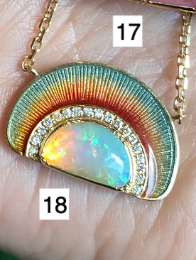 18k gold georgian bezel opal and diamond necklace with hand engraving and enamel detail
