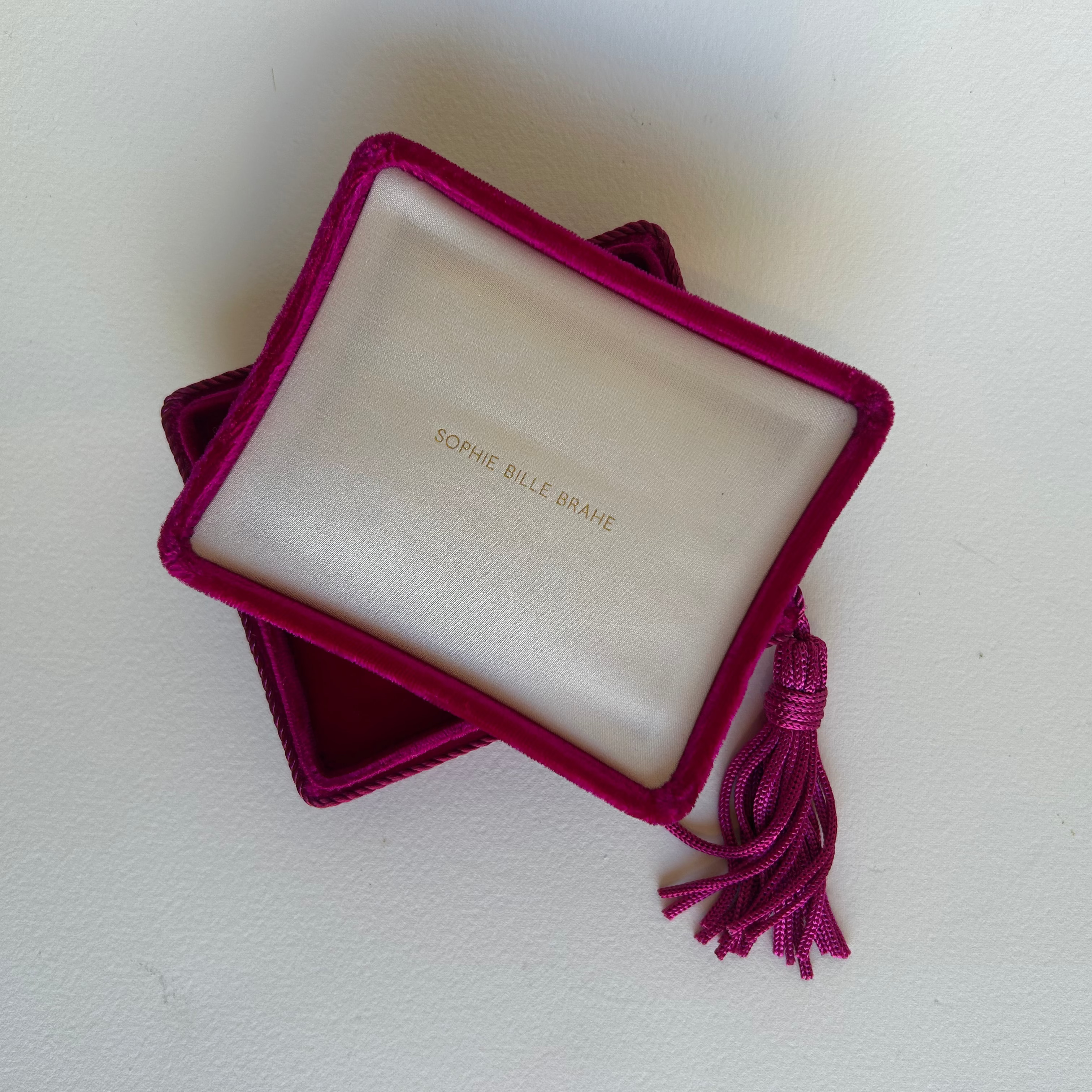 Discover Sophie Bille Brahe's collection of jewelry boxes, perfect for storing and protecting your most precious pieces. The jewellery box collections consist of colourful options in plush velvet with satin lining in various sizes. The smaller Velvet Boxes and the Boîtes are edged with an elegant rope tassel, while Trésor and Trésor Grande feature a compartmentalized interior to organize your most cherished items.